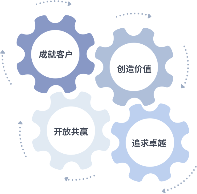 成就客户是一切决策的出发点,,创造价值是衡量所有工作的标准,,,,追求卓越是我们做事做人的态度,,开放共赢是我们的格局也是最终的结果。。。。价值观的齿轮环环相扣,,推动着组织里的每个人不断向前。。。。
